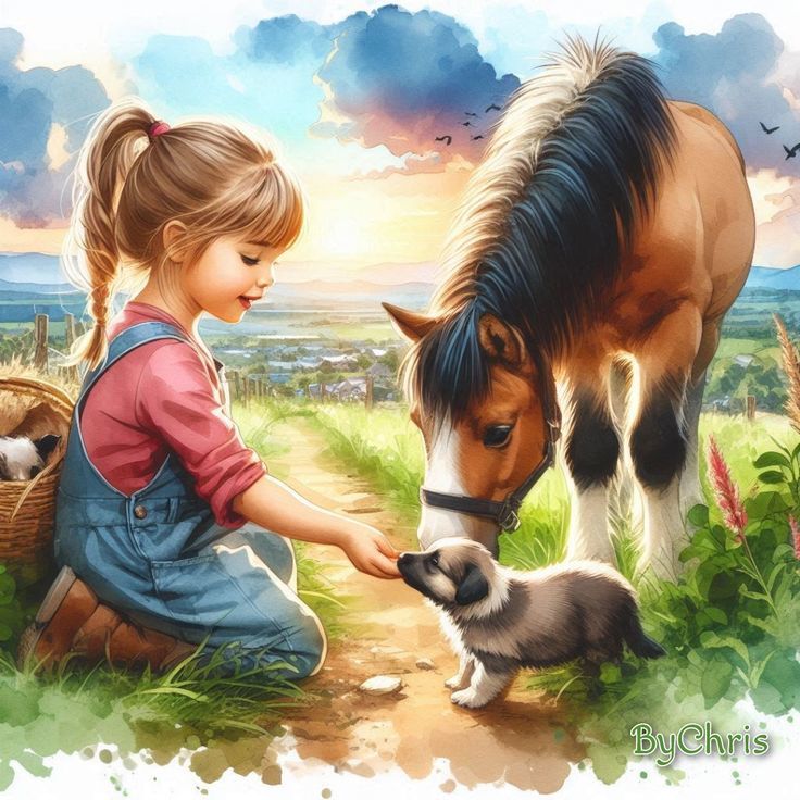 Fillette, chiot et cheval